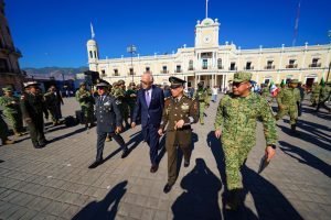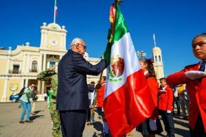 En el marco del Día de la Bandera, el gobernador de Nayarit, Miguel Ángel Navarro Quintero, participó en la solemne ceremonia conmemorativa en la Plaza Benito Juárez de Tepic, acompañado por autoridades civiles y militares, así como por jóvenes escoltas escolares.