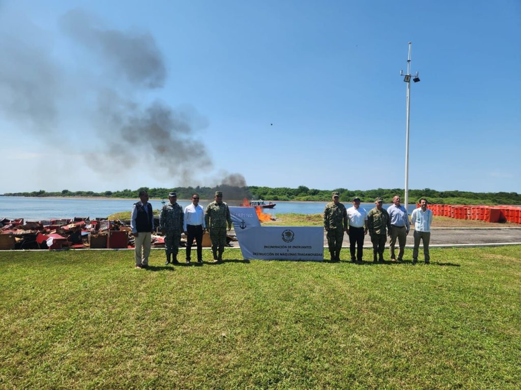 San Blas, Nayarit.– La Secretaría de Marina, a través de la Armada de México y por conducto de la Décima Zona Naval, informa que en cumplimiento al marco legal y normativo vigente, y en estricto apego a los protocolos de seguridad, se llevó a cabo la incineración de aproximadamente 51 kilogramos de estupefacientes, así como la destrucción de 135 máquinas tragamonedas, cuatro chalecos y tres placas balísticas, en las instalaciones de esta Zona Naval.