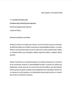 La alcaldesa de Tepic, ingeniera María Geraldine Ponce Méndez, envió una carta a la dirigente nacional de su partido, Luisa María Alcalde Luján, en la que demuestra un contundente oficio político, al convocar en su mensaje a la unidad en las filas de MORENA, reiterando que participará en el proceso para la definición de la Coordinación de los Comités de la Defensa de la Transformación en Nayarit.